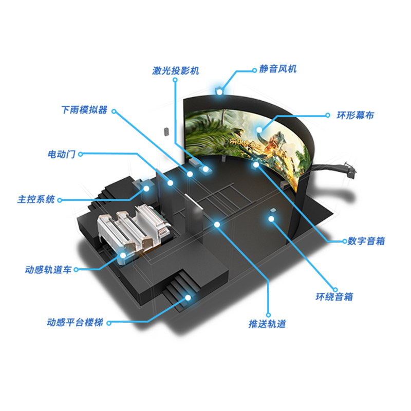 軌道影院內置半球形傾斜巨幕,在影院體驗時看到,電影的畫面布滿了整個半球體,再配合動感座椅和多聲道的立體聲效果,使得觀眾猶如置身于影片之中,身臨其境地伴隨著情節的發展而體驗到跌宕起伏的觀影樂趣。