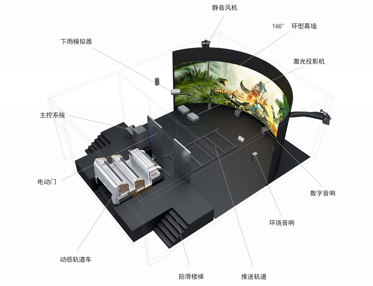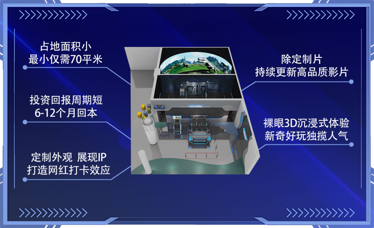 阿哩樂裸眼3D穿越軌道影院采用了環(huán)球影城和迪士尼主要應(yīng)用的環(huán)幕技術(shù),具有浸入式裸眼3D效果,是目前全球領(lǐng)先的特種電影技術(shù),在國內(nèi)非常少見。我們不僅高品質(zhì)完美呈現(xiàn)了這項(xiàng)技術(shù),而且創(chuàng)造性的小型化以適應(yīng)所有的室內(nèi)場(chǎng)所,同時(shí)把成本降到可承受的范圍內(nèi),能夠廣泛普及這項(xiàng)游樂應(yīng)用,影片播放時(shí),飛行動(dòng)感平臺(tái)配合影片做出俯沖,搖晃等動(dòng)作,提供真實(shí)刺激的飛行體驗(yàn)。屏幕上的超長(zhǎng)跨度的廣闊畫面充滿觀賞者的視野,全方位立體聲與影片情節(jié)相輔相成、完美配合,演繹精彩絕倫的沉浸式視聽享受。